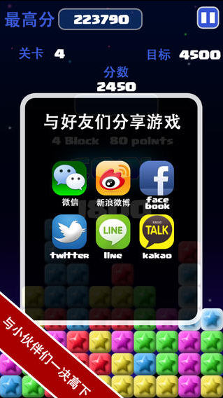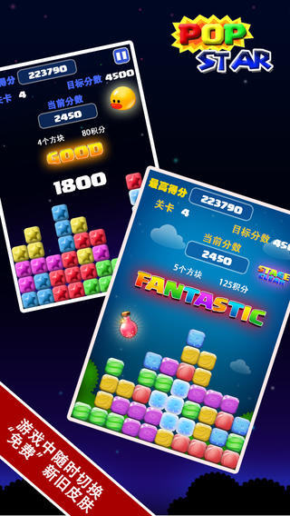 中国区游戏下载量TOP10的popstar满天星又回来啦!与你一起度过2014新年!画面和可玩性优于市面上任何一款同类游戏,你还在犹豫什么,免费的全关卡,免费的神奇宝石道具,赶快拿起你的手机下载吧,一起来挑战最高分!